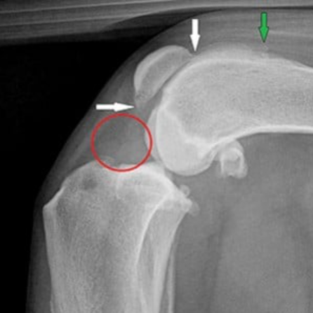 Osteoarthritis (white and green arrows) and joint fluid (red circle) indicative of cruciate rupture. Image credit: TVP